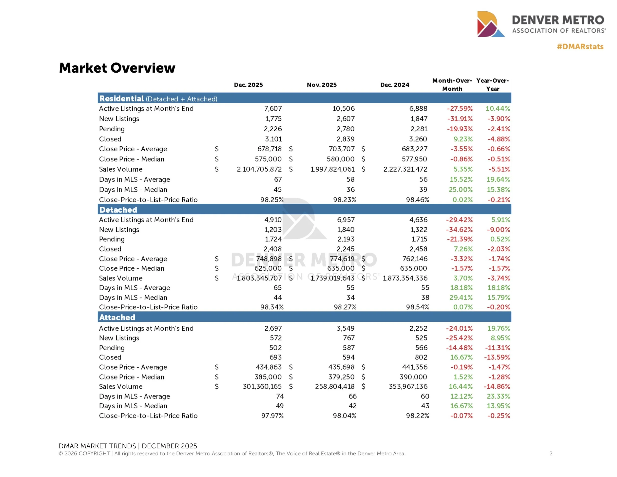 The 2025 market remained fairly flat year-over-year. The median sale price in the Denver Metro area increased by just 0.39% for detached homes, and attached home prices decreased by 2.85%. The combined median sale price of attached and detached homes in 2025 was just 0.85% higher than in 2022.